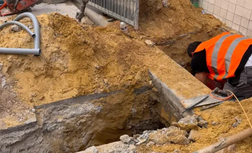 Réalisation d’une tranchée en zone urbaine dense, dans le cadre d’un raccordement télécom.